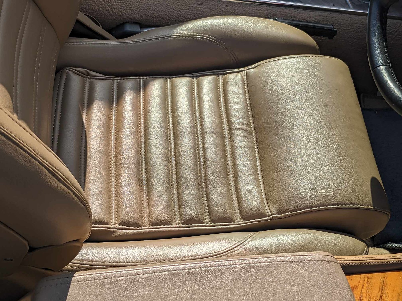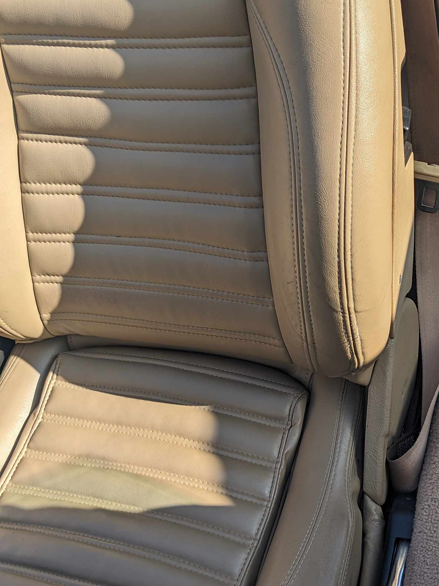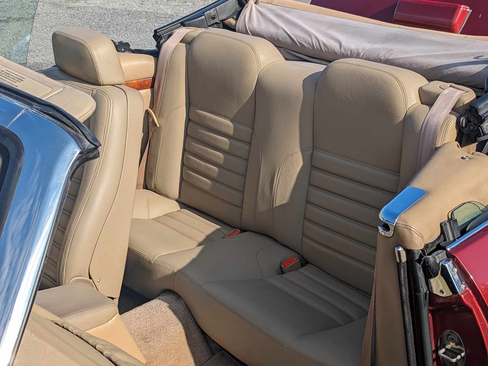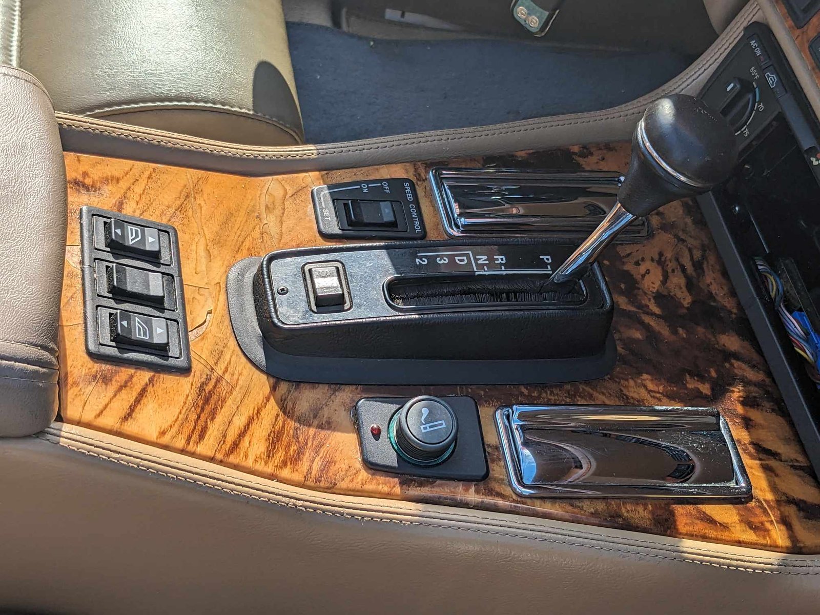 The interior includes power-adjustable front sport seats and two rear bucket seats in cream leather. Interior features include a cassette stereo, a remote-controlled CD changer, cruise control (in need of repair), and automatic climate control. The seat upholstery, center console trim, and armrest trim are in excellent condition with no tears.